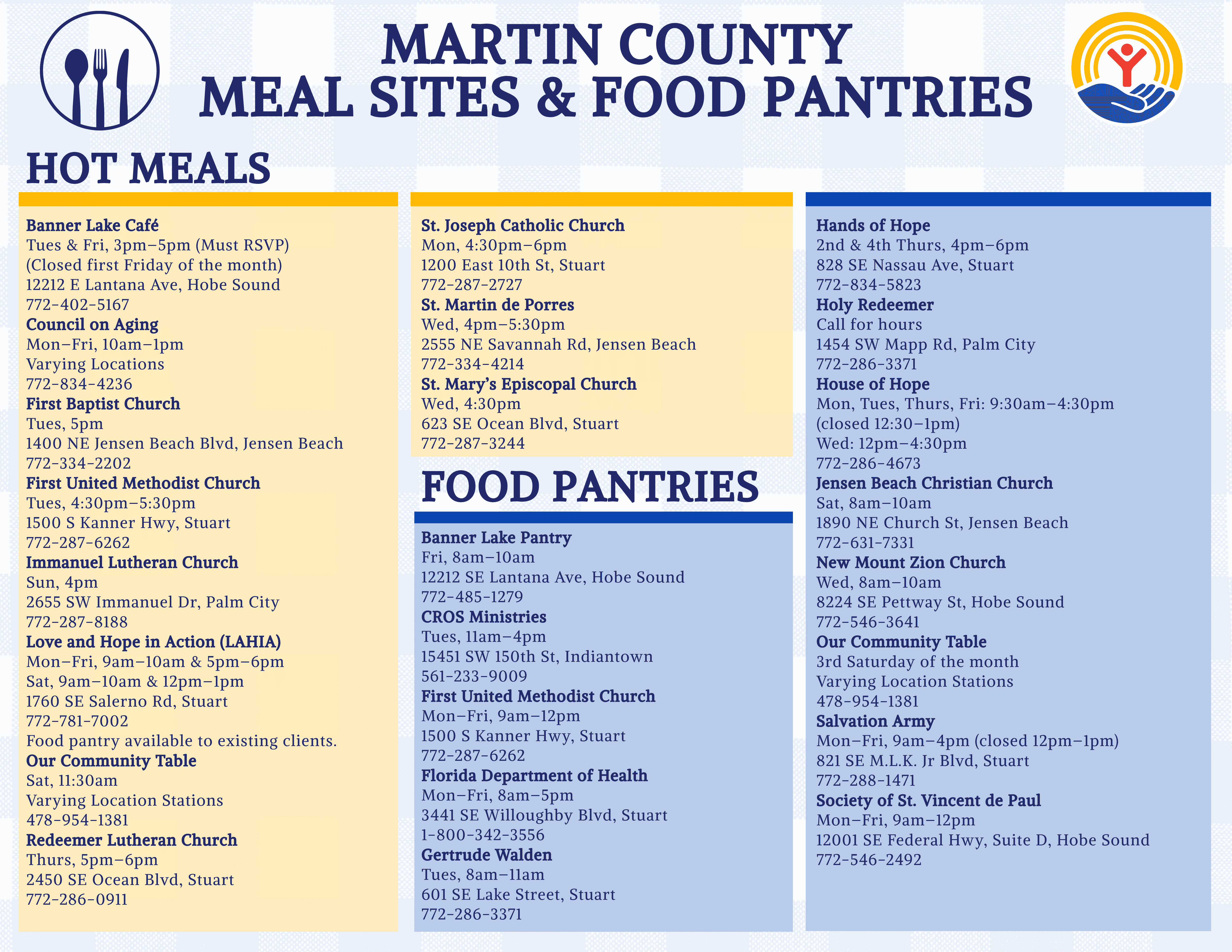 Martin County is committed to making sure no one goes hungry. Thanks to the support of local organizations and partners, residents can access a hot meal every day of the week. United Way of Martin County is actively working to expand and update this vital resource.